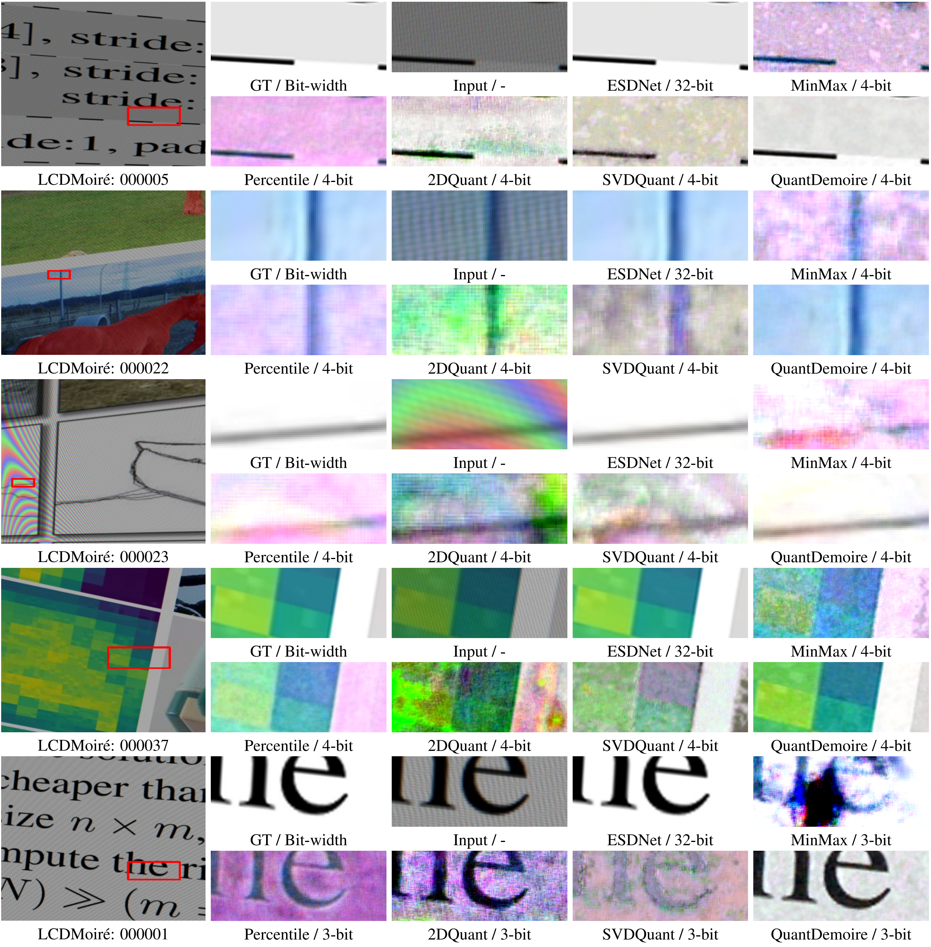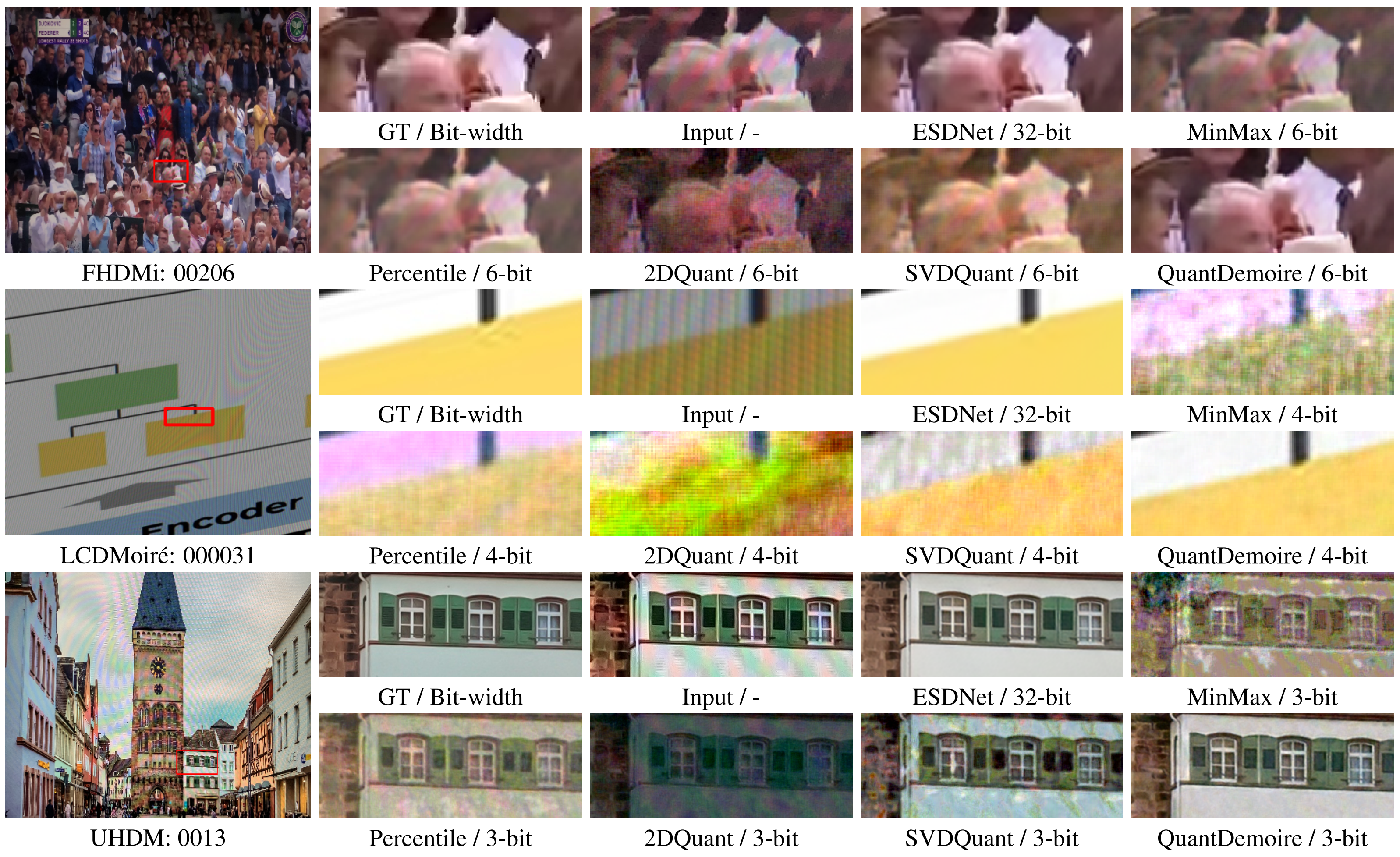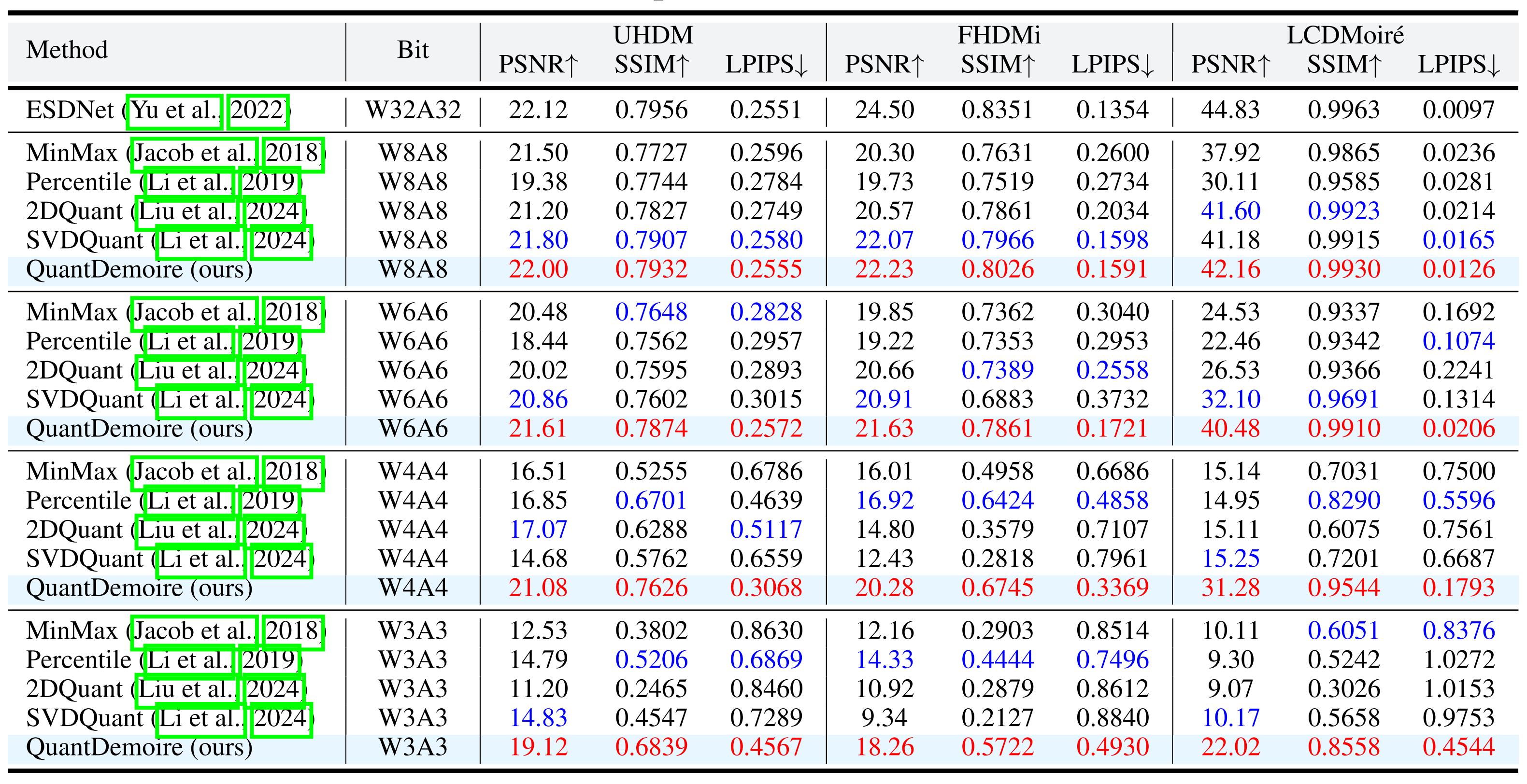 QuantDemoire outperforms existing quantization methods across multiple metrics: