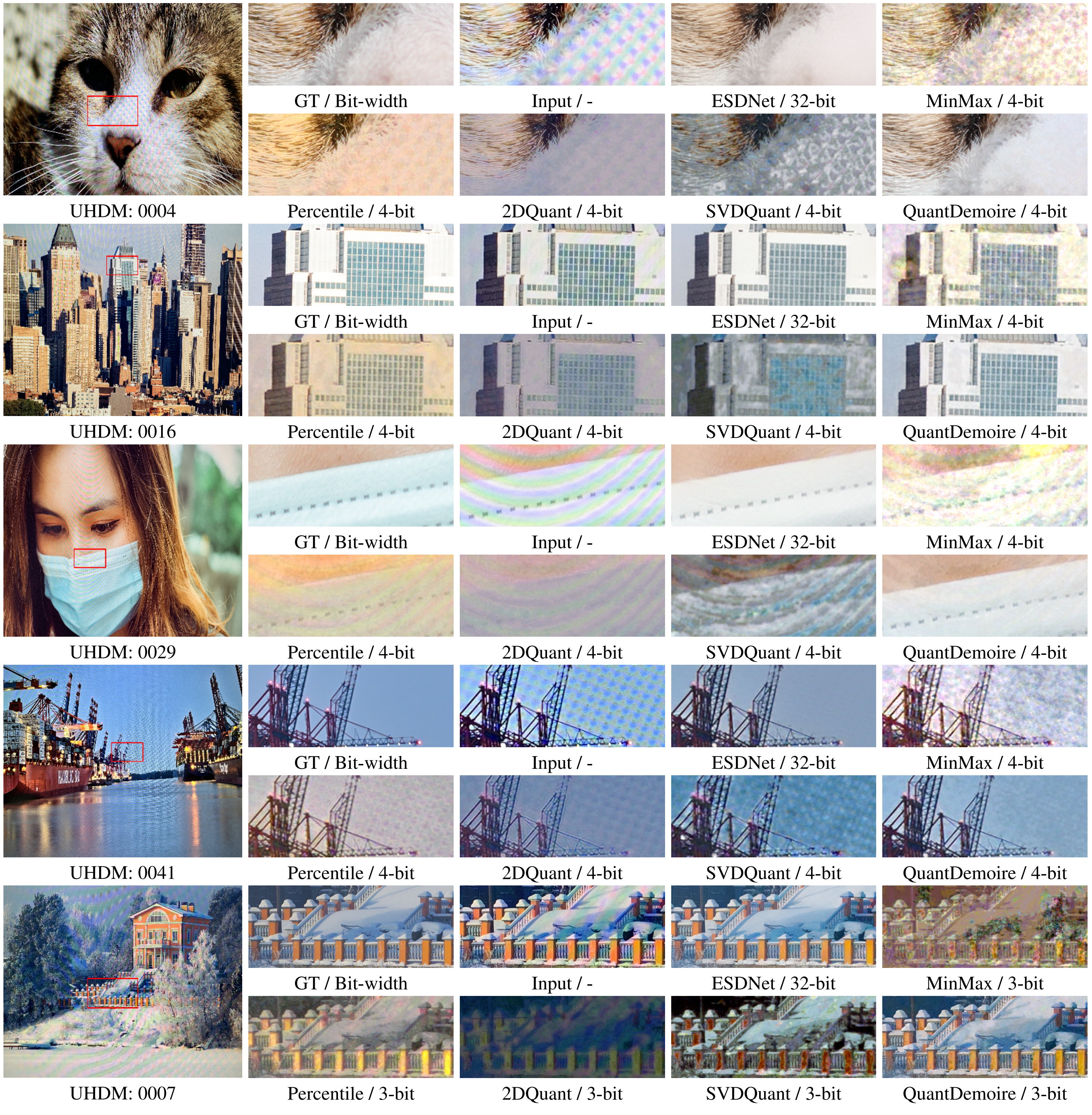 QuantDemoire consists of two key components: (1) Outlier-aware quantizer: Reduces errors from outliers; (2) Frequency-aware calibration strategy: Emphasizes low- and mid-frequency components during fine-tuning, mitigating banding artifacts caused by low-bit quantization.